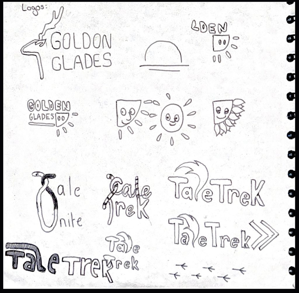 On the right I brainstormed words that could be used together to get the right name for the project. I was often drawn to names that used alliteration as it made the brand seem more child-like and poetic (with alliteration and rhymes being heavily used within children’s books). On the left I started to think about the logo, which I found came much easier after changing the name to ‘Tale Trek’ as it seemed to have way more possibilities of being creative within the word.