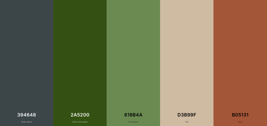 For the colour palate I wanted to stick to earthy, warm tones as those colours are what’s most commonly found in nature. I used the rust colour in the logo as the tail was supposed to be that of a fox which I believe the burnt orange-y colour further emphasises. I will use white text on top of the darker Blue, green and orange shades and then use black text on top of the lighter tan and fern green colours to ensure that the contrast always meets the set requirements.