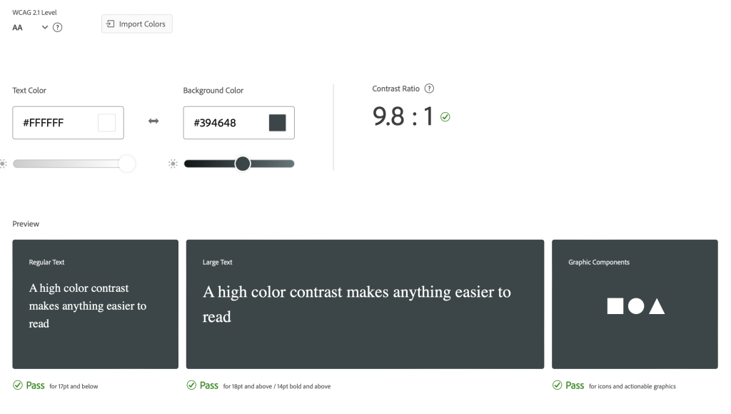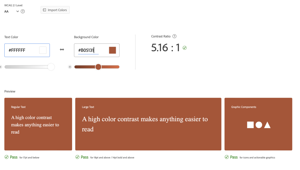 Adobe Colour also allows you to check the contrast levels to make sure the text would be readable. I first inputted my orange colour which I will definitely use as a background somewhere along my project and it meets both AA and AAA demands. The same goes for the dark blue shade in my palate.