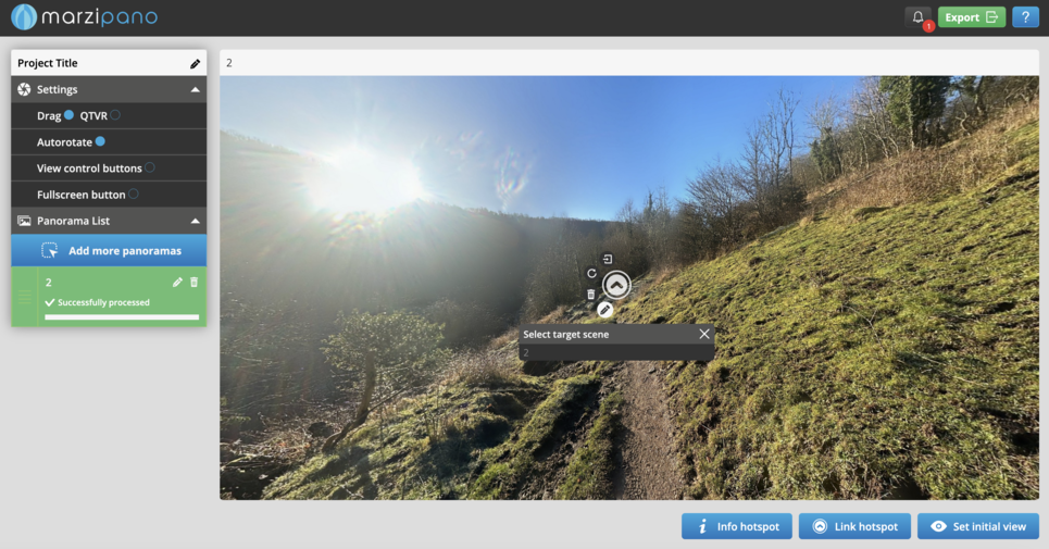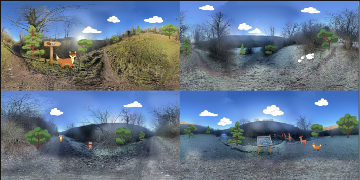 I then input my 360 images into some virtual tour software which translated the flat images into moveable 360 photos that were interactive. I used buttons to link the scenes together so that the story could be told in order at the same time as presenting the nature reserve trail to the viewer.