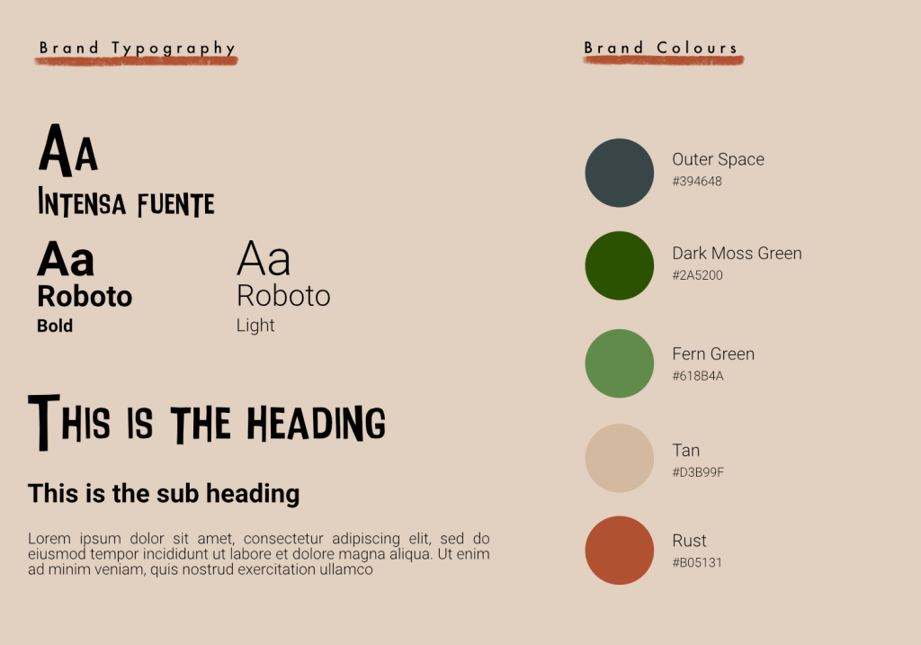 Tale Trek is a brand that is immersed within nature and the countryside, so naturally I’ve chosen colours that emulate those that are found in the wild. I also wanted them to be soft, muted hues as to not be overstimulating for children as this reserve is a place for peace and relaxation. Both Outer space and Dark moss green are colours that represent the depth within the trail e.g the dark woods and flowing rivers which I can also use as the text and background colours within my brand identity as they allow for good legibility when read against lighter colours. The lighter colours: Fern green, Tan and Rust complement the darker ones nicely and represent the flowers and animals seen along the reserve. Rust, especially, will be used frequently as that’s the main colour of the central figure ‘Finn the fox’.